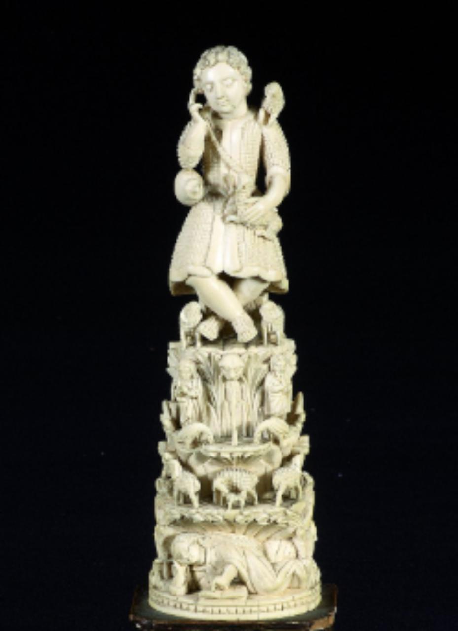 Fregi e incisioni: basamento circolare, figura maschile "Buon pastore" con gambe incrociate, intagli con figure di animali, figura semi coricata alla base, vegetazione con fonte d'acqua.