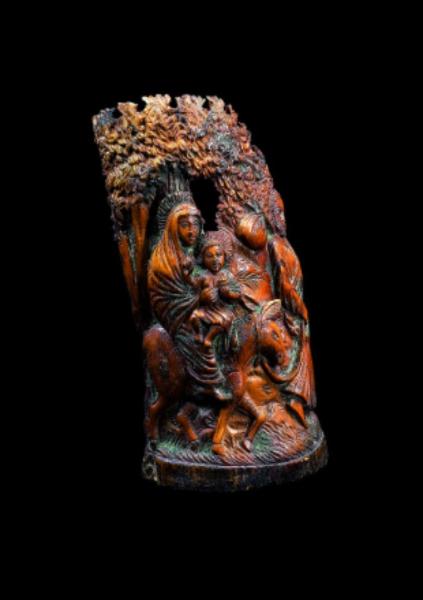 Fregi e incisioni: basamento circolare, figure della sacra Famiglia con Madonna e Bambino in groppa ad un asino guidato da San Giuseppe, alberi con foglie incise.