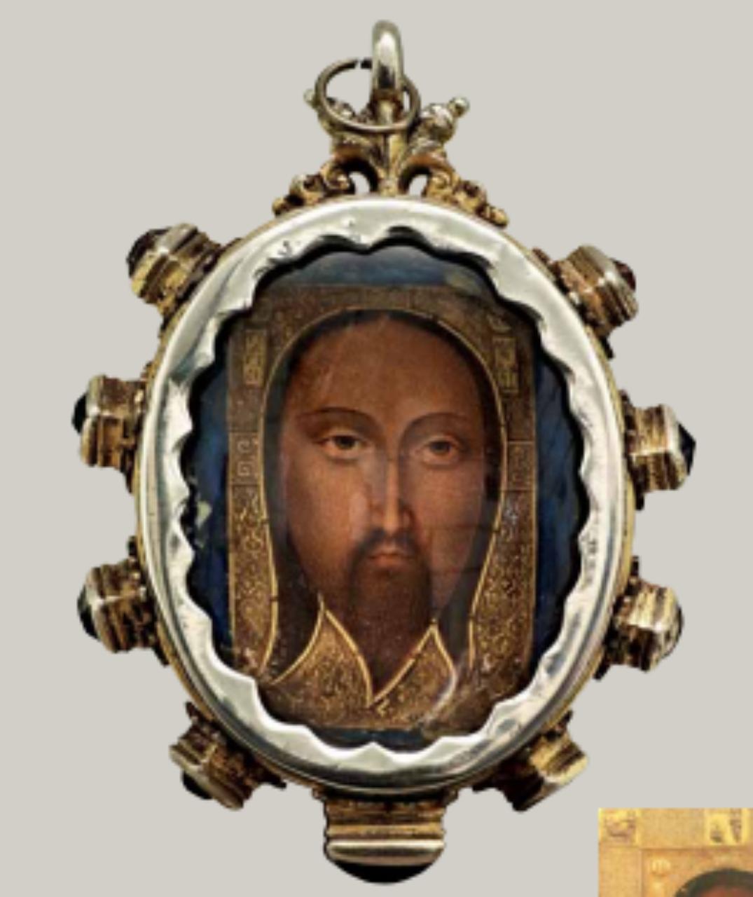 Fregi e incisioni: cornice in argento modanato con nove pietre dure incastonate, miniatura al recto è riprodotto il Santo Volto. Iscrizioni: sul verso della teca sull’ovale esterno «CORPORA FAC DIVUM DEVOTO PECTORE GESTE[S] SIC PLACATA TIBI NUMINA CUNCTA FORENT», sull’ovale interno «IHS / OMNES SANCTI ET SANCTAE DEI INTERCEDITE PRO NOBIS», sulle altre minori semi ovali «S. THOMAE A. / S. BARTHOLOM. / S. ANDREAE / S. IO BAPTISTAE /S. IACOBI AP. / S. SIMONIS / S. LUCAE A. /S. M. MAGDALE. /S. VRSVLAE».
