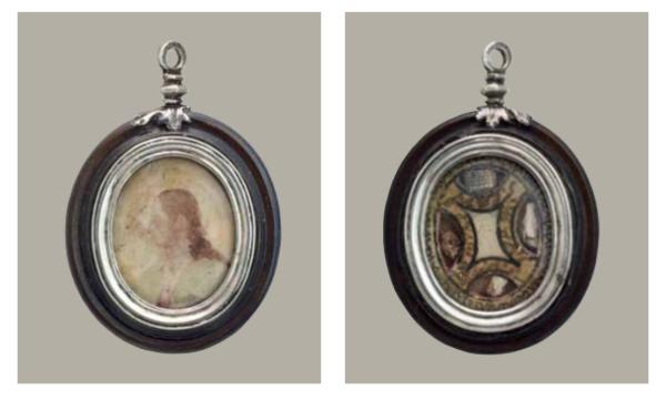 Fregi e incisioni: al recto immagine su miniatura Cristo di profilo, al verso cartoncino decorato e reliquie. Iscrizioni: «Camis[…] di S. Carlo et S. Vitto / rie, ve., M. et Valeriani, M. / et Placidi, M. / Reliquia (sic) di d. S.».