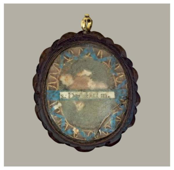 Fregi e incisioni: cornice modanata e fascia liscia. Iscrizioni: al recto «S. Iulia M.», al verso «S. Deodati M.».
