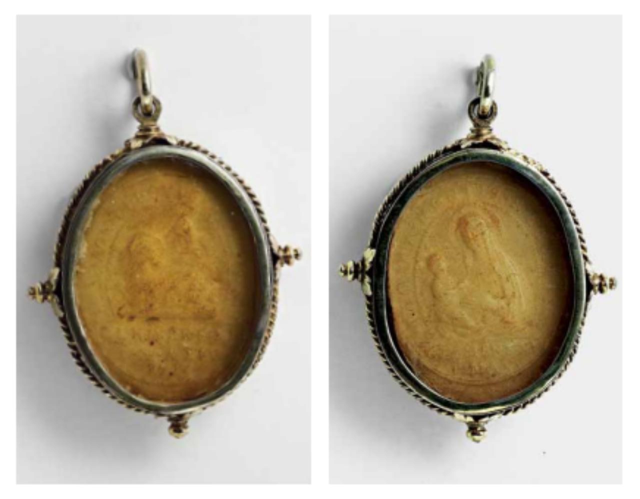 Fregi e incisioni: cornice modanata, bassorilievi in cera al recto Agnello mistico, al verso raffigurazione della Madonna con Bambino. Iscrizioni: impresso sulla cera, al recto nel giro «ECCE AGNUS DEI QUI TOLLIT P. MUNDI» all’esergo «CLEMENS XI / P. M. A. XIV / 17[14]»; al verso nel giro «REGINA MONTIS REGALIS» all’esergo «CLEMENS XI / P. MAX».