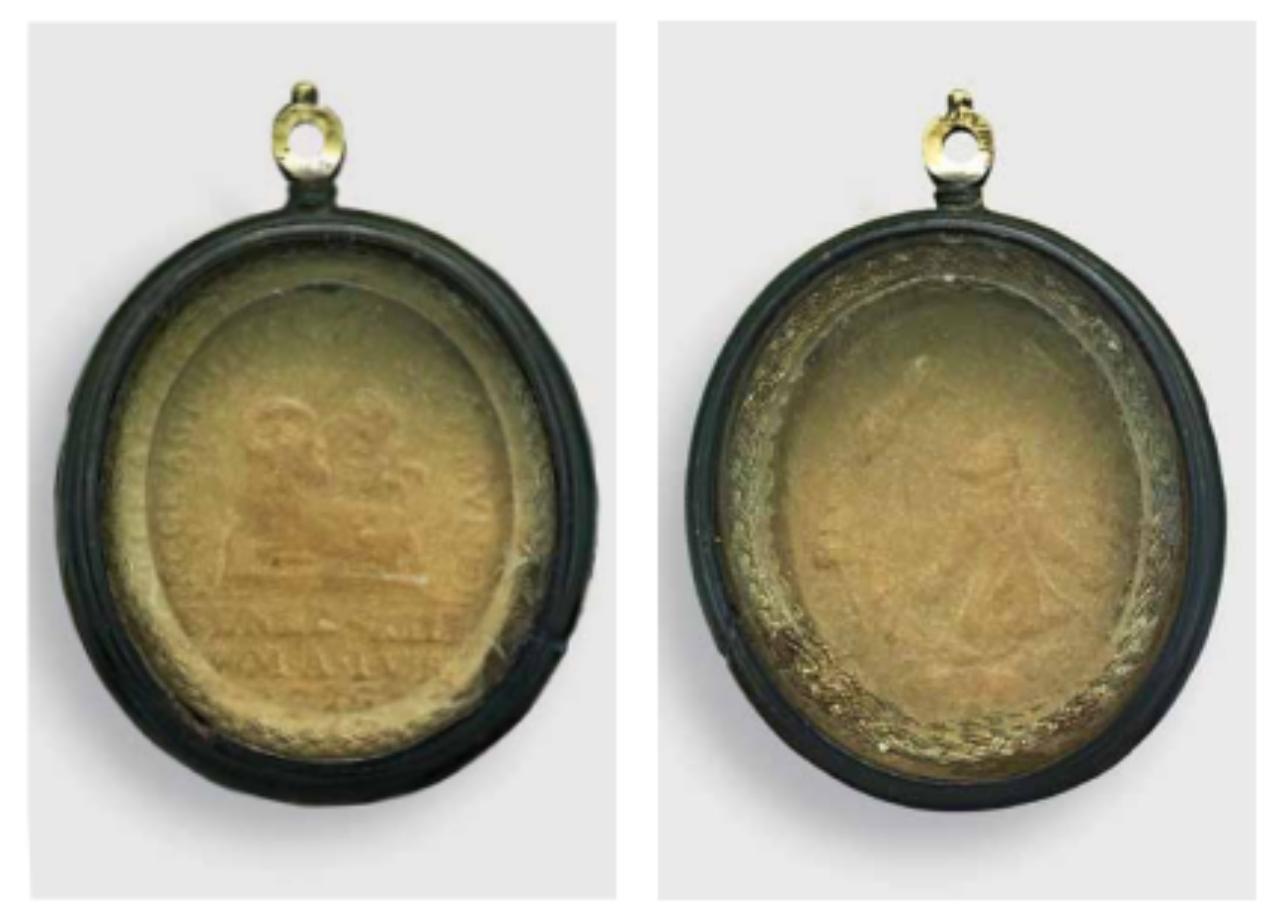Fregi e incisioni: cornice modanata, bassorilievi in cera al recto Agnello mistico, al verso raffigurazione di san Francesco d'Assisi. Iscrizioni: impresso sulla cera, al recto: nel giro «ECCE AGNUS DEI QUI TOLL. P. MUNDI» all’esergo «BENED. XIII / P. M. A. IVB. / 1725»; al verso «[…]».