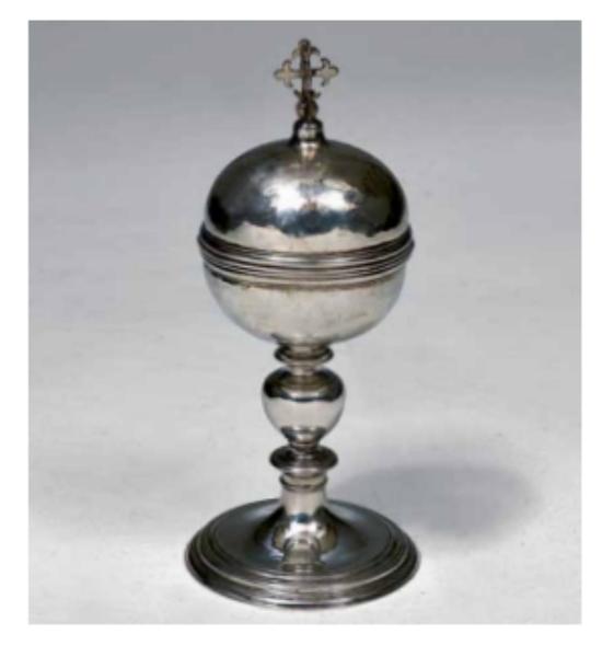 Fregi e incisioni: piede a sezione circolare con orlo modanato, fusto con coppia di rocchetti a disco che racchiudono il nodo principale ovoidale, coperchio liscio con doppia crocetta latina apicale dalle estremità gigliate su semisfera.