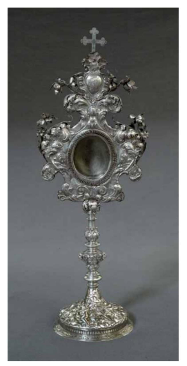 Fregi e incisioni: base a sezione circolare, piede con tre angioletti con i simboli della Passione: il flagello, il velo della Veronica e la corona di spine, che termina in un alto collo. Un rocchetto funge da raccordo con il fusto che si articola in due nodi a fusione: quello principale piriforme dove al di sopra di un giro di foglie aggettano tre cherubini alternati a motivi di frutti e foglie, quello secondario a balaustro, ricoperto da foglie d’acanto, sviluppato in una serie di rocchetti. Il ricettacolo, lavorato sulle due facce, ha teca a luce ovale, ornata da una cornice a filo ritorto, ripetuta sul verso, circondata da rigogliose foglie d’acanto speculari, che proseguono a formare la cimasa, sormontata da un medaglione ovoidale compreso entro foglie più piccole sulle quali si innesta la crocetta apicale con terminali gigliati.