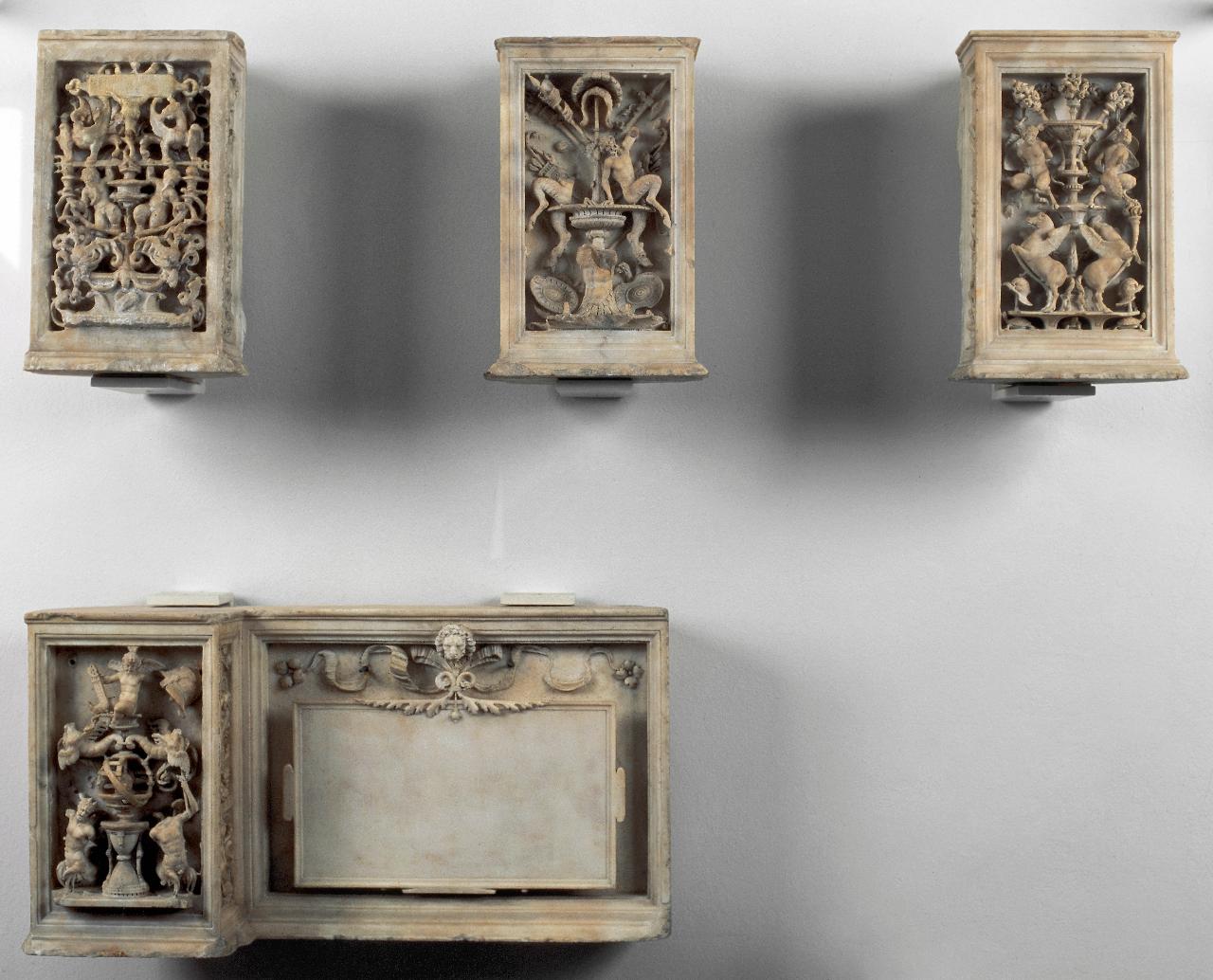 Pilastrino scolpito su tre lati con decorazioni fitomorfe, grottesche classicheggianti e trofei militari