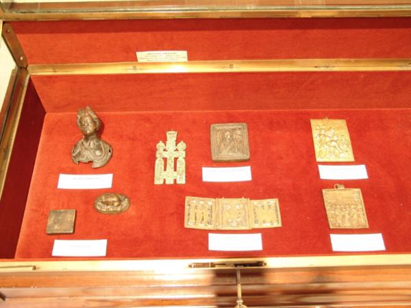Piccolo busto femminile in funzione di maniglia, dotato di perno di fissaggio in ferro che trapassa il collo e sporge sul retro; cavo all'interno tranne che nella testa, piena; due fori laterali