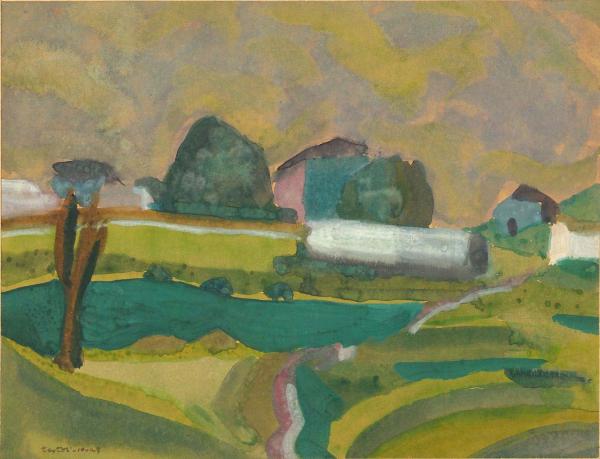 - NOTIZIE STORICO CRITICHE Sul fronte in basso a sinistra: "Testori - 10 - 43"; sul retro in basso a destra: "Prati e ville" / Sormano / Testori - 10 - 43". \nIn una lettera a Walter Ronchi databile tra il 19 e il 30 novembre 1943, Testori scrive: \n“Io quest’estate ho lavorato moltissimo, soprattutto alla pittura, benché solo ora cominci a veder saltar fuori qualcosa di buono: anzi sono sicuro che questo qualcosa e` dovuto al lungo lavoro di revisione e di studio che ho fatto quest’estate. Di positivo ho fatto due tempere (ritratti), due quadri a olio (“Donna nel bosco” e “L’incendio”, quest’ultimo non ancora terminato), una serie di acquarelli (paesaggi) che tra l’altro mi sono serviti per incontrarmi col paesaggio, e una buona serie di disegni."