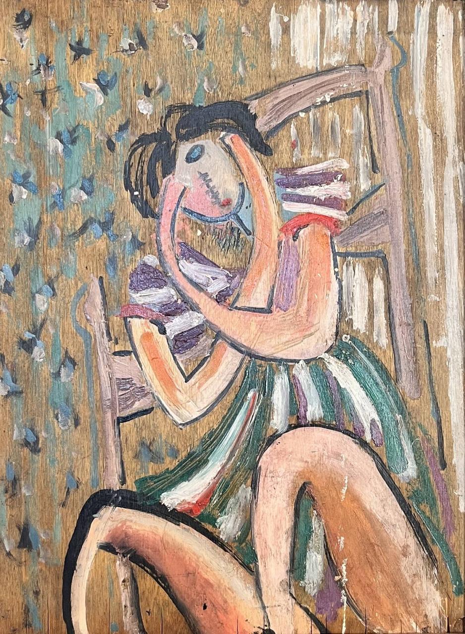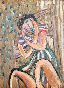 [Donna seduta con braccia incrociate]. figura femminile seduta