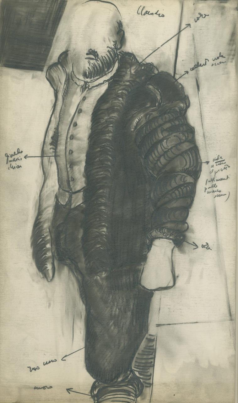 Disegno preparatorio per costume di scena.\nIl costume di scena riprodotto è circondato da annotazioni a matita che indicano il nome del personaggio e il riferimento ai tessuti e ai colori da utilizzare per la realizzazione dell'abito.