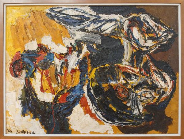 Composizione ascrivibile all'Espressionismo astratto con pennellate vorticose e materiche bianche, nere, blu, gialle, rosse.