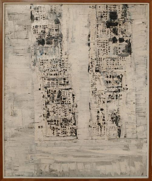 Veduta di città di segno sintetico ed espressionistico, quasi informale, giocata sui toni del grigio con larghe pennellate. Si indovinano i profili di palazzi suggeriti da pennellate nere.