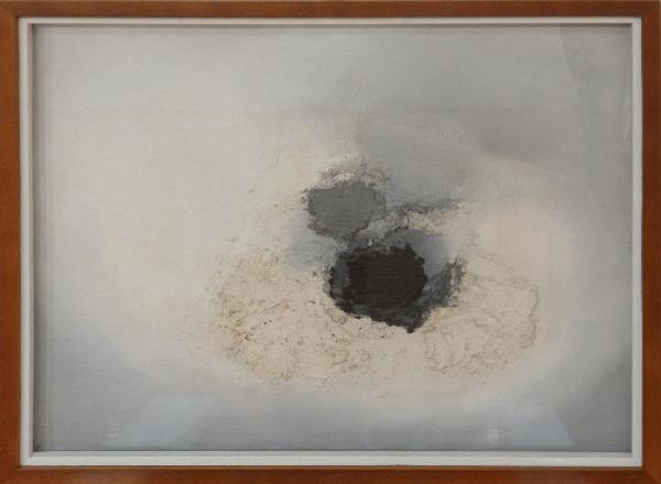 Composizione informale caratterizzata da pittura polimaterica e agglutinata: colle, sabbie e pittura. Il fondo è chiaro con agglomerati di materia dai colori neri, grigi e bianco crema.