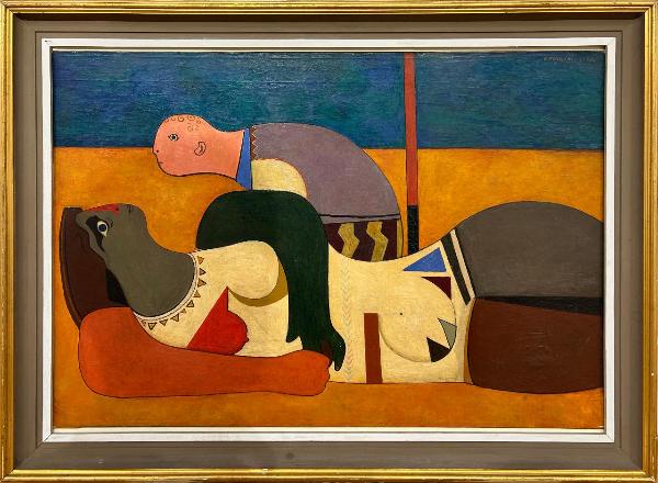 Composizione caratterizzata da un realismo "populista" costituita da due figure umane in un paesaggio essenziale, rese con forme curve e nette e contorni sottili. In primo piano una figura femminile reclinata dall'incarnato scuro, che sembra indossare un vestito con motivi geometrici. Dietro una figura maschile dall'incarnato roseo curva e seminascosta dalla donna.
