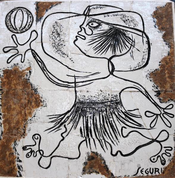 - NOTIZIE STORICO CRITICHE Il pannello di destra del trittico scultoreo realizzato da Albano Seguri dal titolo "Bambini che giocano al pallone" raffigura un bambino che gioca con la palla. La figura è stata tracciata con un movimento rapidissimo della mano che pare inseguire un febbrile arabesco. Ritornano così le modalità grafiche, le matasse di gesti e di moti e i voluti effetti d’abbozzo e di improvvisazione caratteristici dell’arte di Seguri. Come in altre sue opere, l’artista intraprende la strada del grottesco e del caricaturale e genera un forte rapporto di complicità tra la scultura e il disegno. Definito “comico scoppiante” dalla vitalità pura, Seguri libera nelle sue lastre una fantasia dal “ghirigoro” infinito con i piedi che invitano alla danza.