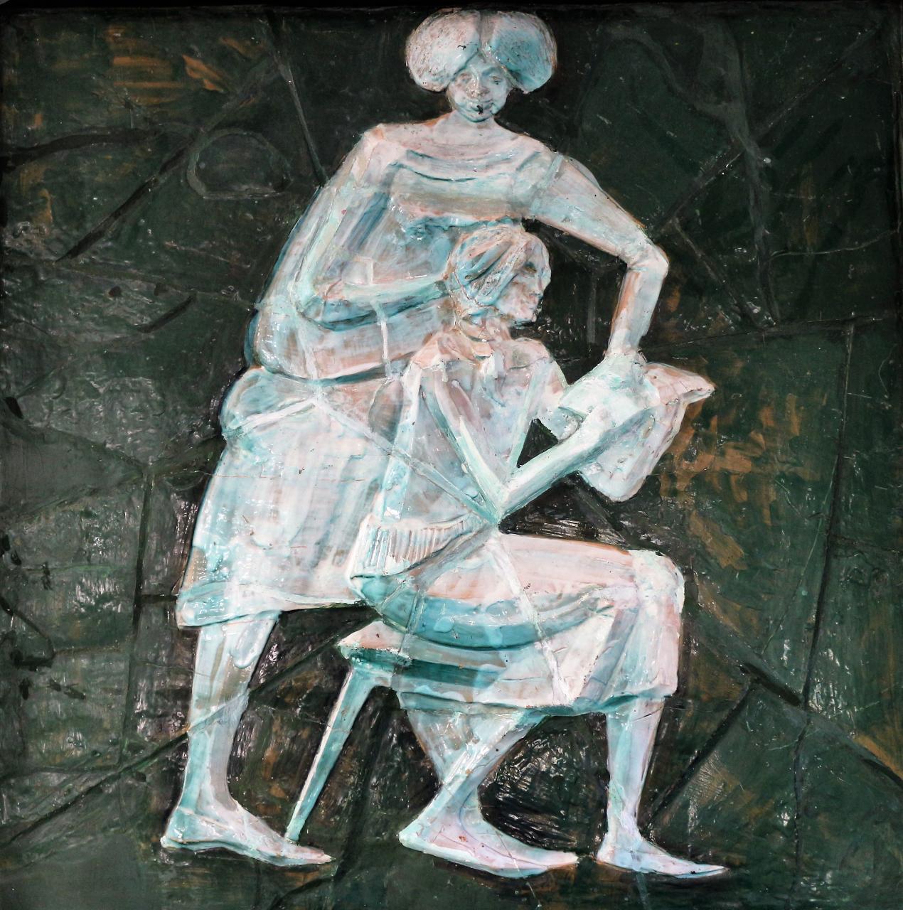 Pannello di forma quadrata lavorato a bassorilievo. Ceramica smaltata a fuoco e invetriata. Intelaiatura di ferro.