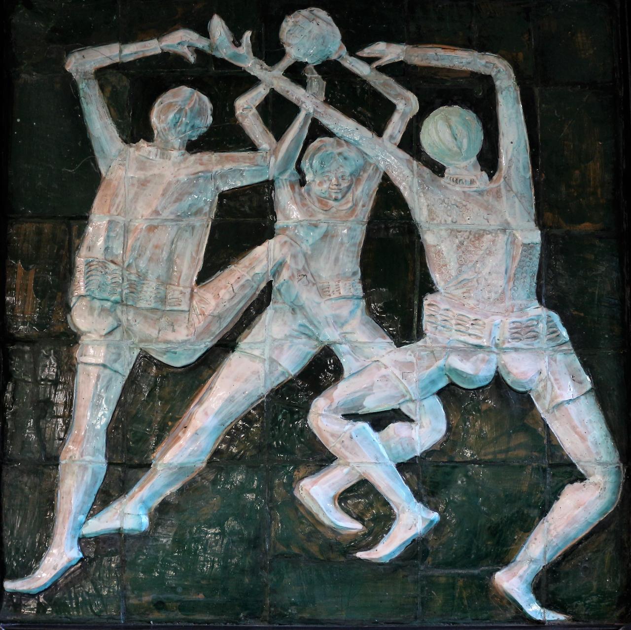 - NOTIZIE STORICO CRITICHE Nel pannello centrale del trittico scultoreo "Scuola" di Cesare Leonbruno Lazzarini sono raffigurati tre ragazzi, due ritratti di spalle e l’altro di fronte, mentre giocano al pallone abbigliati con pantaloncini corti e maglie a maniche lunghe. I soggetti sono rappresentati in svariate posizioni a dare l’idea del movimento.