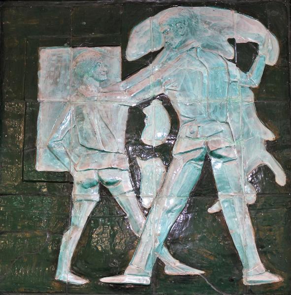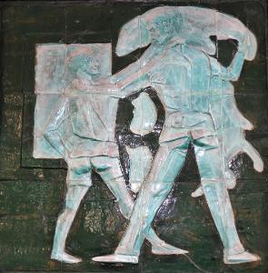 Pannello di forma quadrata lavorato a bassorilievo. Ceramica smaltata a fuoco e invetriata. Intelaiatura di ferro.