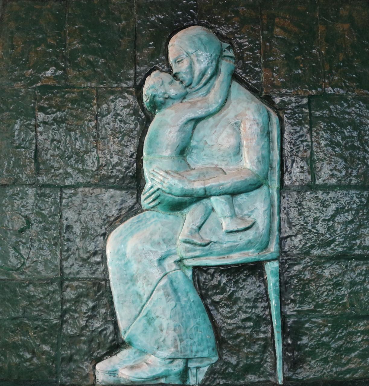 - NOTIZIE STORICO CRITICHE Nel pannello dal titolo "Maternità", facente parte del trittico scultoreo "Scene di Famiglia" di Enzo Nenci, si scorge la figura di una madre seduta su una sedia rappresentata di profilo mentre abbraccia il proprio bambino. Si tratta di una delle più significative espressioni del sentimento di elevazione che lo scultore più volte ha espresso con esiti rettilinei. Le figure, di colore verde-azzurro, emergono da un fondo verde scuro.