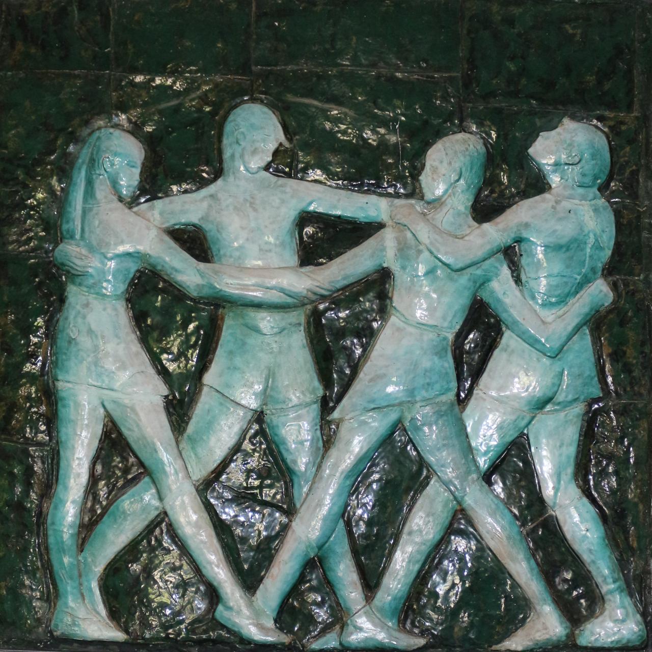Pannello di forma quadrata lavorato a bassorilievo. Ceramica smaltata a fuoco e invetriata. Intelaiatura di ferro.