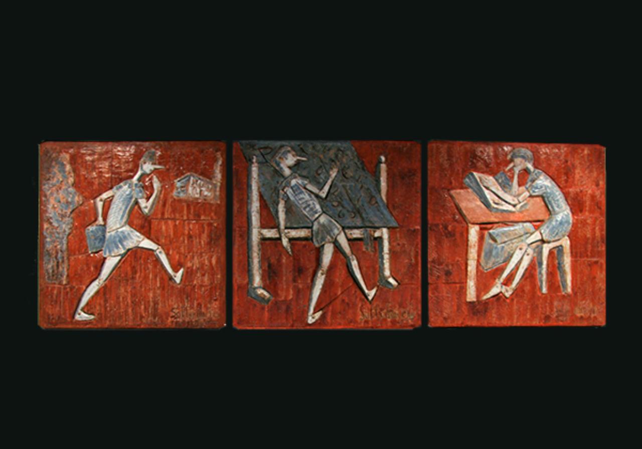 Trittico scultoreo formato da pannelli lavorati a bassorilievo. Ceramica smaltata a fuoco e invetriata. Intelaiatura di ferro.