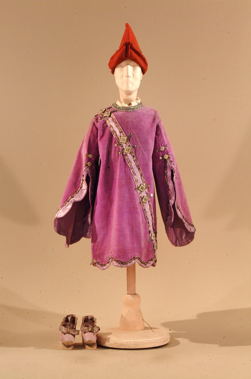 Costume per cavaliere di foggia medievale composto da veste, cappello e scarpe.