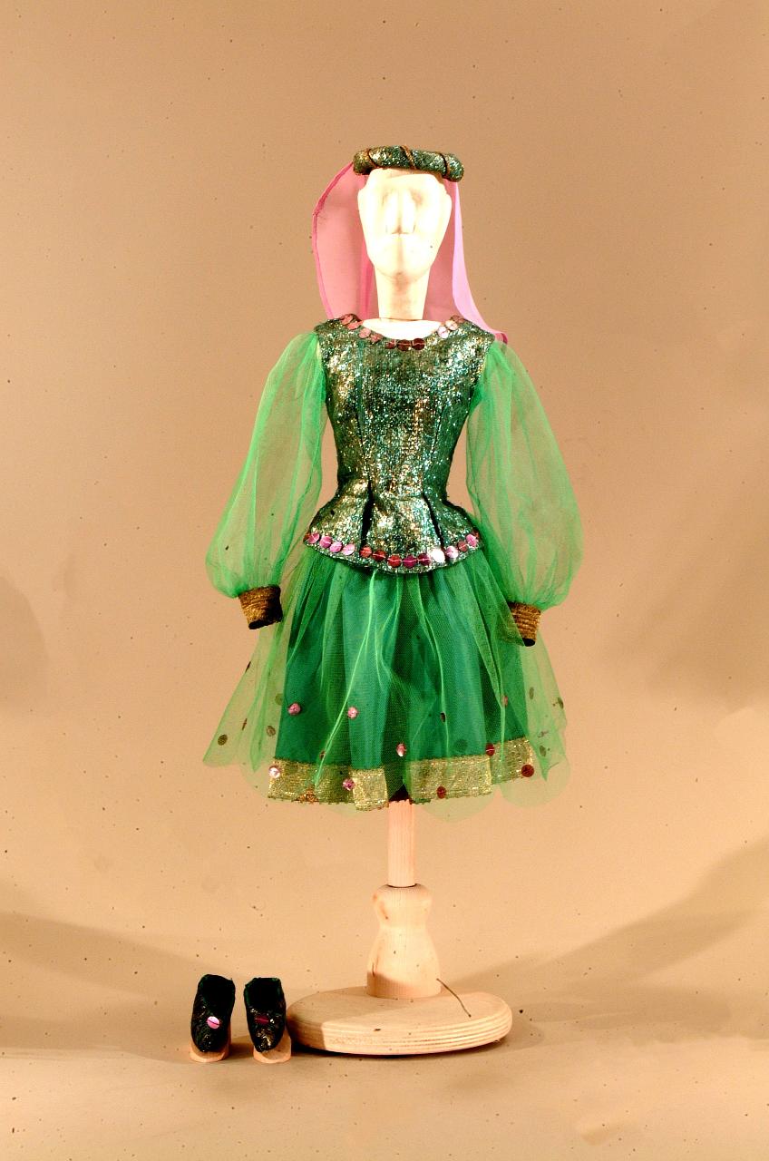 Costume per ballerina di foggia rinascimentale composto da gonna, corpino, copricapo e scarpe.