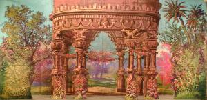 Scenografia in carta dipinta ad acqua e fortezzata con strisce di tela, composta da un principale e un fondale. Il principale viene posizionato al ponte.