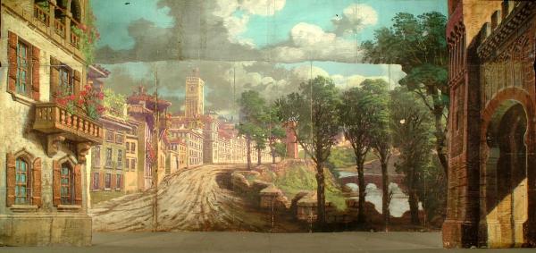 Scenografia in carta, fortezzata con strisce di tessuto di cotone, dipinta ad acqua e composta da un principale e un fondale. Il principale viene posizionato al ponte.