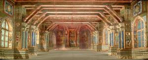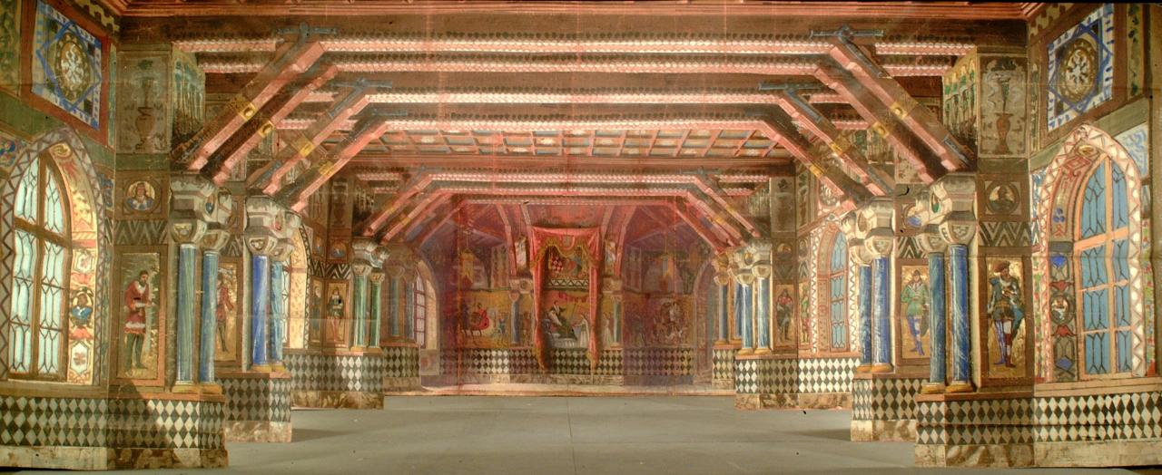 Scenografia in carta, fortezzata con strisce di tessuto di cotone, dipinta ad acqua e composta da un fondale ed tre principali.