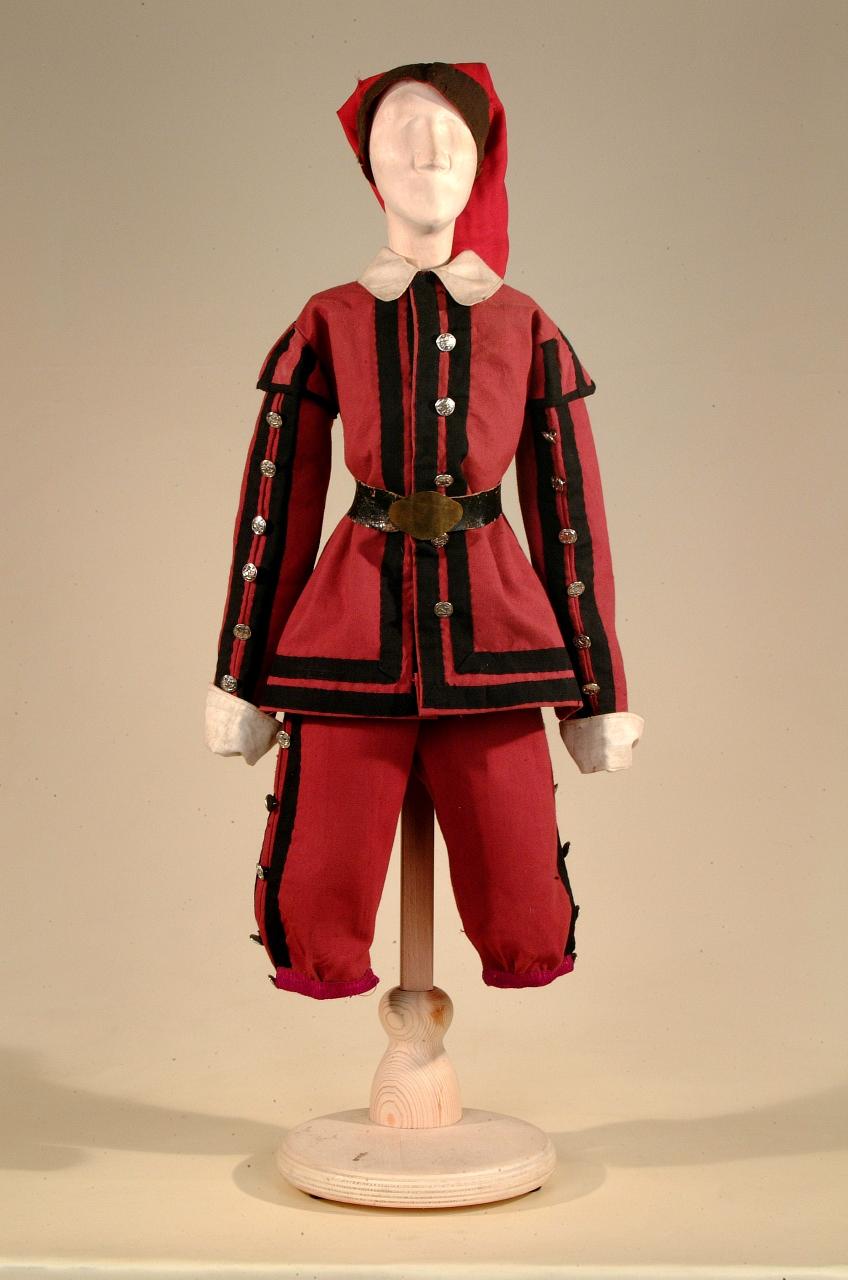 Costume di popolano del '600 costituito da pantaloni, giacca, cappello e cintura.
