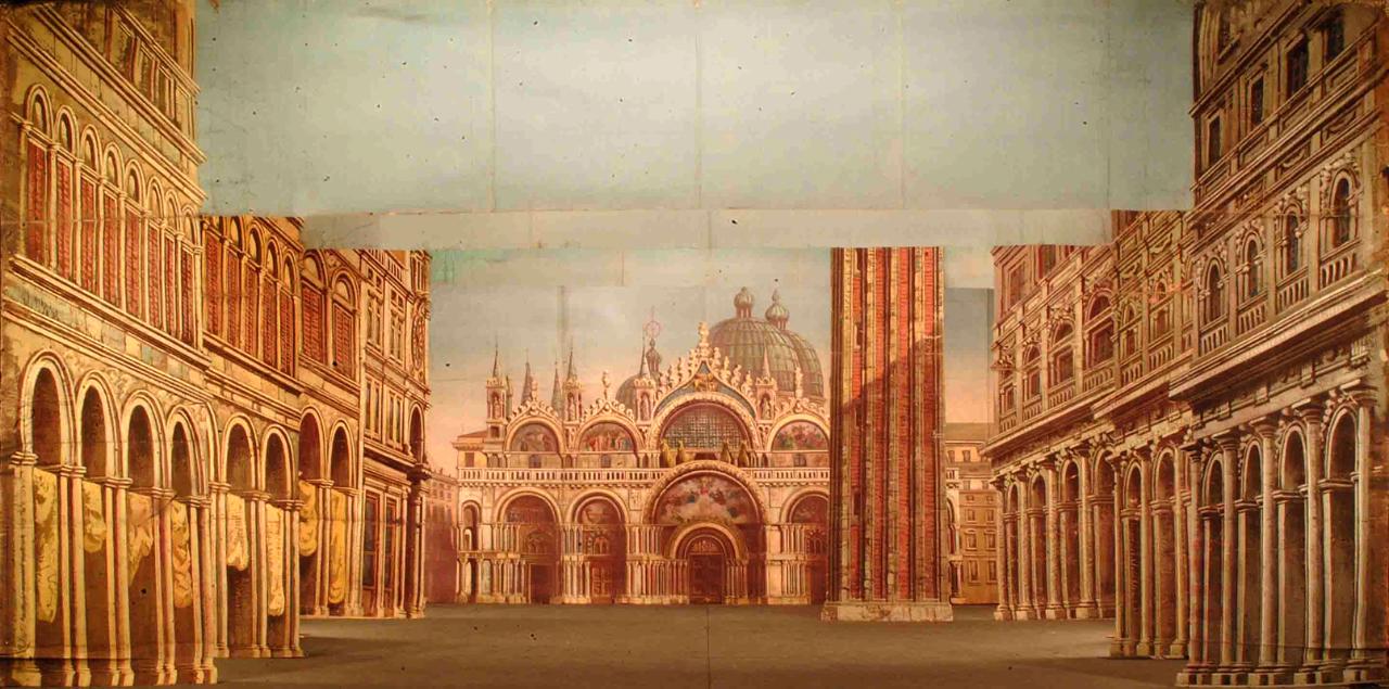 Scenografia in carta dipinta ad acqua e fortezzata con strisce di tela, composta da tre principali, due rompimenti e un fondale. I due rompimenti corrispondono a due campanili: durante il periodo in cui il campanile, crollato, era in costruzione, veniva usato il campanile con le impalcature. Il secondo principale viene posizionato al ponte.