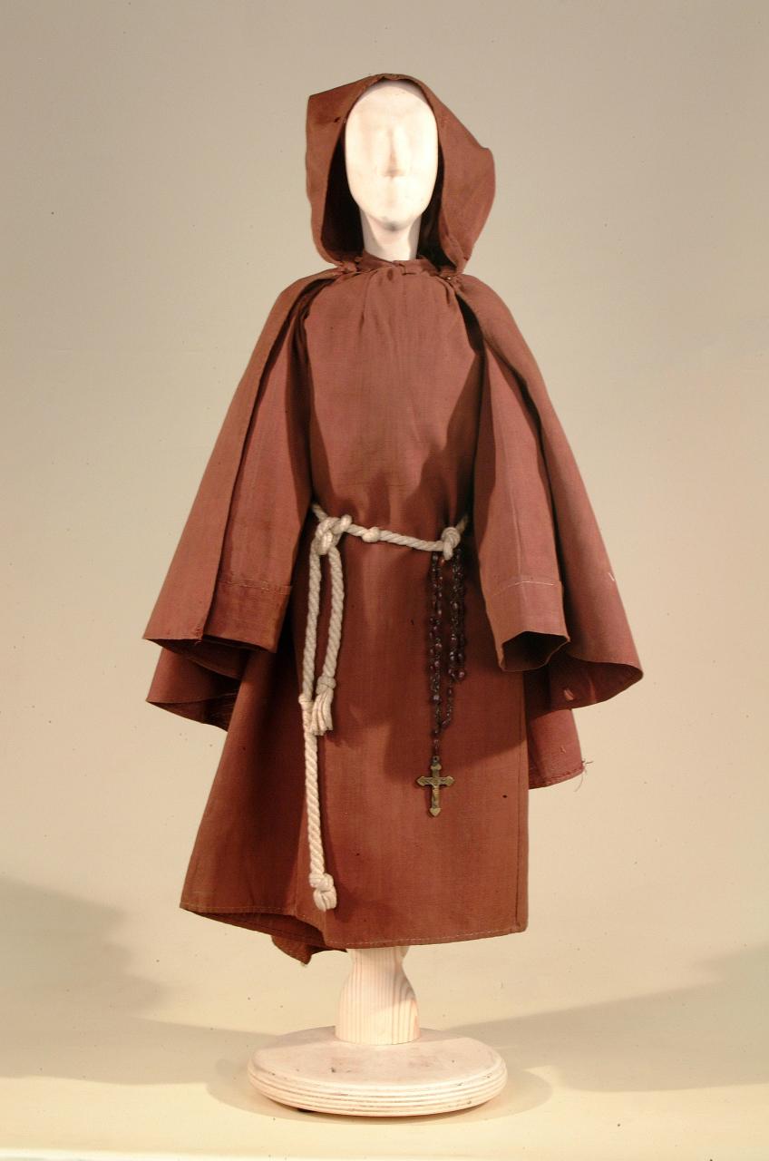 Costume di religioso per frate composto da saio, mantello, cappuccio e cintura.