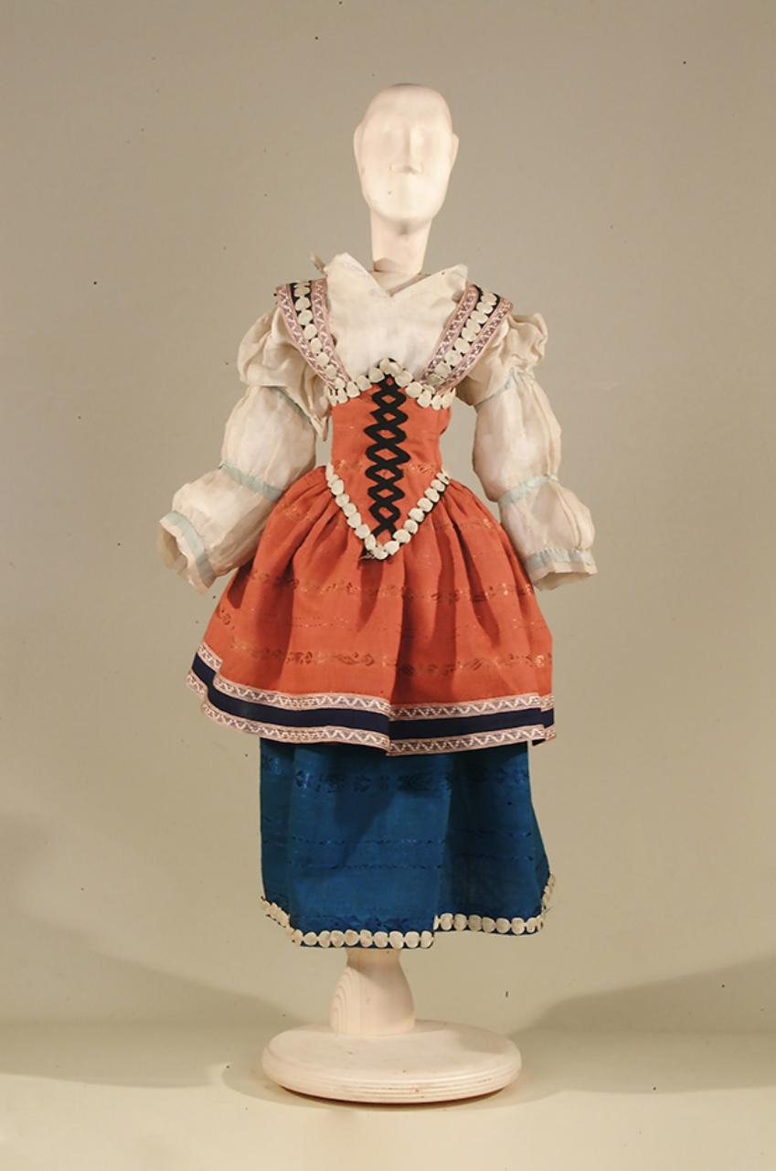 Costume per popolana di foggia cinquecentesca composto da gonna, camicetta, bustino e bretelle.