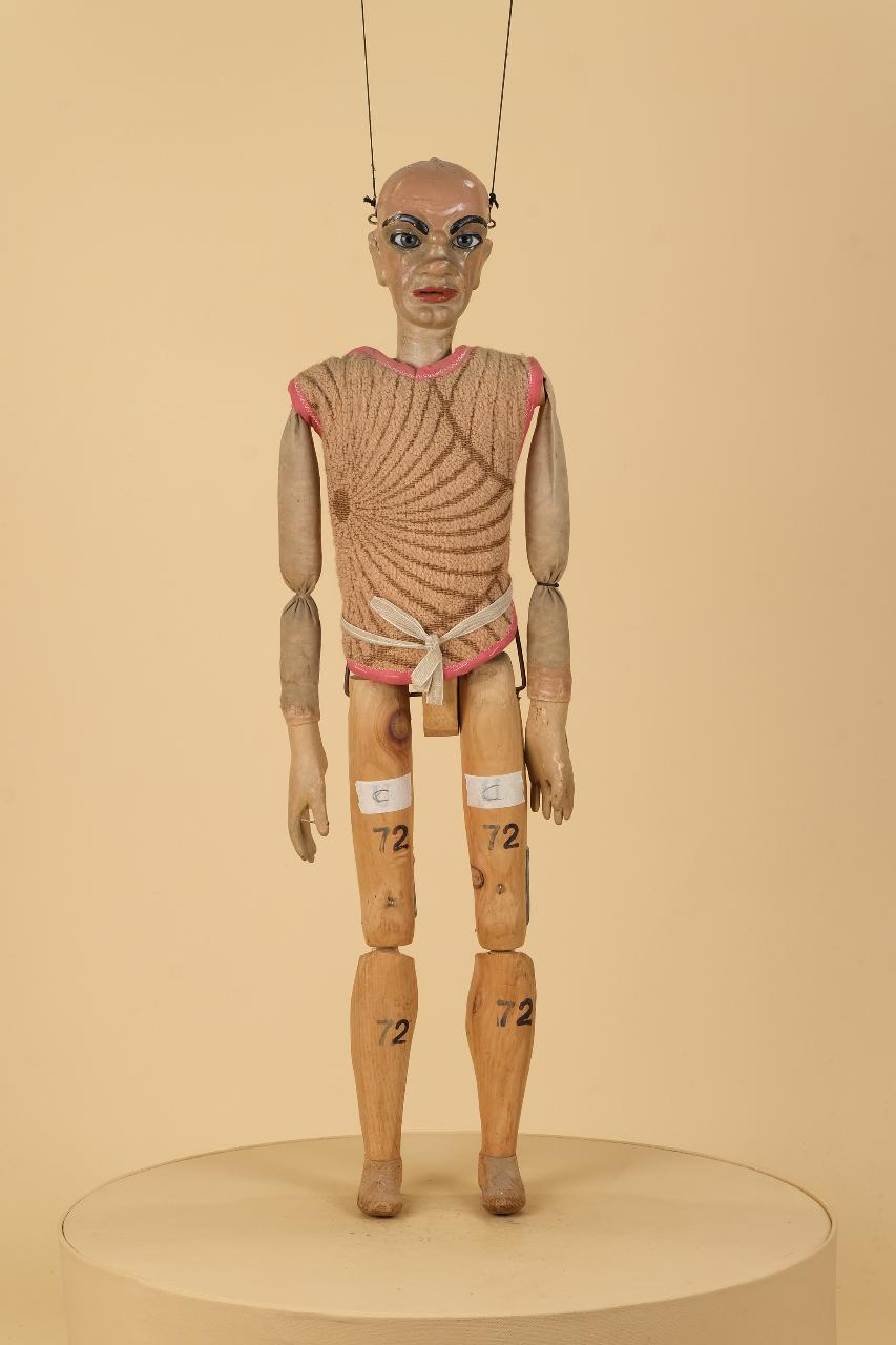Testa in legno di tiglio fissata al corpo tramite ferro; occhi di vetro; corpo normale in cirmolo; gambe attaccate con ferro al bacino; ginocchia ad incastro; piedi piombati; mani in tiglio con dita unite. Piedi fissi. Bilancino originale da marionetta in coppia, metodo Holden.