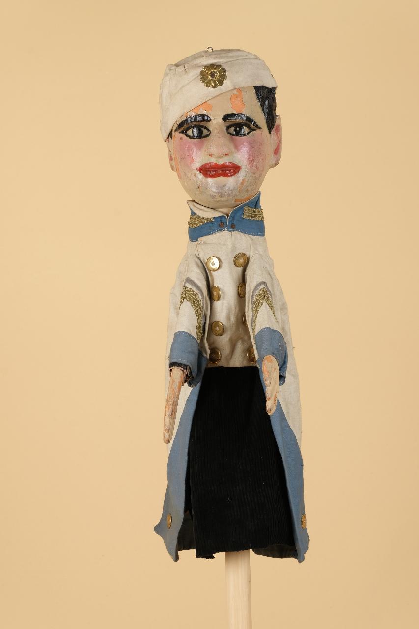 Questo burattino raffigura un personaggio in uniforme militare, probabilmente un ufficiale.