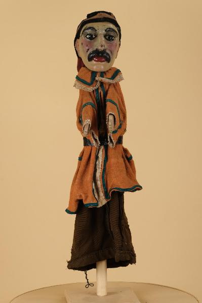 Questo burattino presenta dettagli stilistici che richiamano un personaggio popolare o forse un bandito.