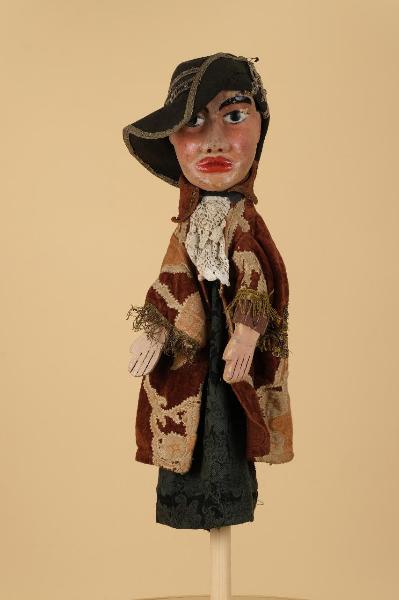 Questo burattino presenta dettagli stilistici che richiamano un personaggio popolare o forse un bandito.