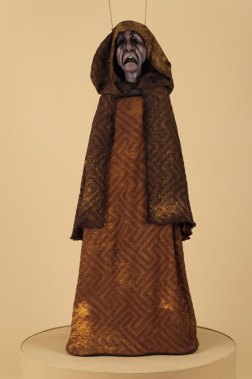 La marionetta raffigura il personaddio simbolico di un "ipocrita" e fa parte di un gruppo di otto figure simili. Il personaggio è costutuito dalle sole mani e testa in legno e un corpo in tessuto vuoto senza alcuna articolazione. Il volto riporta una smorfia di sofferenza e dannazione accentuata dal vuoto degli occhi e del ghigno della bocca. La testa in legno di tiglio è fissata alle spalle in abete. Il corpo è interamente in tessuto pesante fissato, nella parte superiore direttamente alle spalle, nella parte inferiore ad una tavola in compensato di pioppo che funge da pattino. Un pesante saio con cappuccio in tessuto marrone trattato con colore acrilico color bronzo, ricopre l'intero personaggio. Mani in tiglio. Bilancino particolare.
