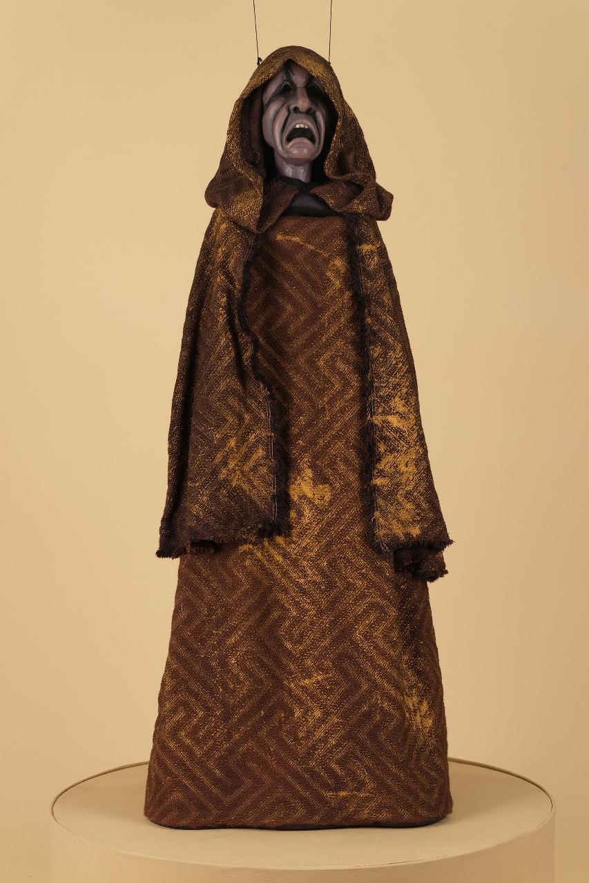 La marionetta raffigura il personaddio simbolico di un "ipocrita" e fa parte di un gruppo di otto figure simili. Il personaggio è costutuito dalle sole mani e testa in legno e un corpo in tessuto vuoto senza alcuna articolazione. Il volto riporta una smorfia di sofferenza e dannazione accentuata dal vuoto degli occhi e del ghigno della bocca. La testa in legno di tiglio è fissata alle spalle in abete. Il corpo è interamente in tessuto pesante fissato, nella parte superiore direttamente alle spalle, nella parte inferiore ad una tavola in compensato di pioppo che funge da pattino. Un pesante saio con cappuccio in tessuto marrone trattato con colore acrilico color bronzo, ricopre l'intero personaggio. Mani in tiglio. Bilancino particolare.