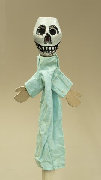 Burattino con la testa che rappresenta il teschio in legno scolpita.