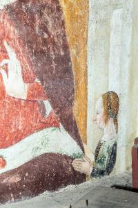 - NOTIZIE STORICO CRITICHE Le sacre figure sono ambientate all'interno di una cappella poco profonda, voltata a botte decorata con cassettoni, che ricorda una delle cappelle appena costruite della chiesa. Il dipinto murale appare oggi tagliato in orizzontale. L'opera rivela strette analogie con le Storie di san Giovanni Battista realizzate da Giovanni della Chiesa nella cappella omonima della chiesa.