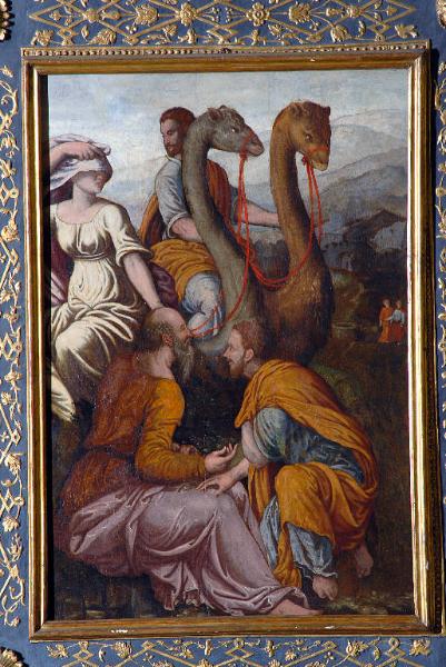 Il dipinto raffigura il corteo nuziale di Rebecca e conferma questa iconografia la scena dipinta sullo sfondo con l'incontro al pozzo tra Rebecca e Isacco. In primo piano vi sono due cammelli che sorreggono la donna e un servitore, mentre due uomini in primo piano sembrano assistere alla scena. Completa l'opera il paesaggio abbozzato.