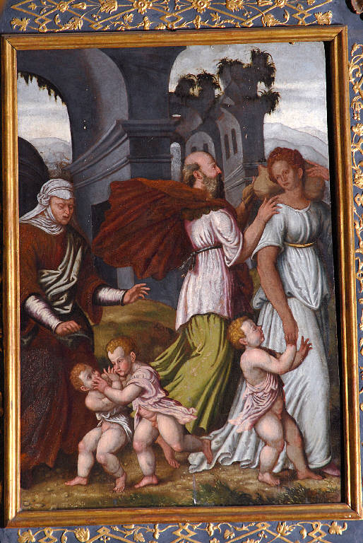Il dipinto raffigura Abramo che caccia la schiava Agar e il loro figlio Ismaele, mente a sinistra compare Sara e due bambini che giocano, forse uno dei due interpretabile come Isacco. La scena si svolge davanti ad una architettura diroccata su cui spuntano delle piante.