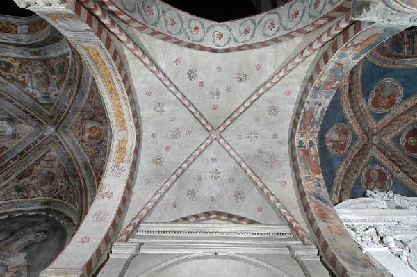 - NOTIZIE STORICO CRITICHE Entro il 1304 dovrebbe essere completata la decorazione ad affresco delle volte: da quelle più semplici a fondo bianco con stelle commiste a fiori o rosette sino ad arrivare a quelle laterali del presbiterio con sfondo blu su cui spiccano stelle dorate e al centro il "tetto a padiglione" multicolore, dipinto come fosse un tessuto pieghettato, motivo decorativo derivante dalla pittura paleocristiana. La volta centrale del presbiterio quale opera del Maestro dei Quattro Elementi, gli Evangelisti sormonati dal proprio simbolo e affiancati da piccole figurette a monocromo rraffiguranti un "Elemento" e un "Temperamento" secondo il seguente schema: San Matteo, Acqua e Flemma; San Marco, Aria e Sangue; San Giovanni, Fuoco e Collera; San Luca, Terra e Melanconia. L'artista, nonostante eviti formule ripetitive e schematiche sia nell'aspetto decorativo dei troni sia in quello più impegnativo dei volti, indagati minuziosamente, mostra qualche incertezza nelle costruzioni anatomiche e nell'ambientazione spaziale, che diviene più certa nella volta con i Dottori della Chiesa, animata da una straordinaria decorazione a "tetto a padiglione" con le quattro vele profilate da una colonnina tortile, che ricorda le Storie francescane di Assisi. La maggior saldezza volumetrica delle figure porta a datare l'affresco entro il 1315-1316. Poco dopo è attivo nella chiesa il Maestro della tomba Fissiraga, autore del celeberrimo affresco posto sopra la tomba del committente, ma anche di una raffinata Madonna col Bambino posta nella navata destra tra la sesta e la settimana campata, e connotata da grande eleganza nelle variazione dei bianchi e ocra, evidenziando punti di contatto con l'arte dell'Italia centrale, soprattutto l'Umbria e la Toscana. Il suo probabile allievo, il Maestro di San Bassiano, è rintracciabile nel Battesimo di Cristo (VI pilastro a destra), in cui appaiono evidenti gli elementi bizantini, la posizione rigida e frontale, con il fiume Giordano tratteggiato come fosse una piccola "montagna" in cui guizzano i pesci coprenti le nudità di Cristo. L'affresco che costituisce però la sua opera più imporante è sicuramente il Funerale di Antonio Fissiraga, databile al 1327 anno della morte del Signore di Lodi, e posto sotto la sua tomba. Una duplice fila di frati francescani reggono le torcie, mentre il Fissiraga, che indossa il saio, è disteso sul catafalco coperto da un lenzuolo funebre decorato con lo stemma della famiglia. Si possono riferire alla mano di questo Maestro anche il San Nicola e un devoto, le Stigmate di San Francesco (IV pilastro a sinistra) e altri dipinti murali. Al quarto decennio del Trecento risale la Crocifissione (I pilastro a destra), in cui spiccano elementi giotteschi come la mano di San Giovanni accostata al viso che riprende il Crocifisso di Giotto della cappella degli Scrovegni o il lacerto con lo stesso tema conservato nella chiesa di S. Gottardo in corte a Milano, o il luminoso e trasperante perizoma di Gesù, ma soprattutto l'impostazione spaziale. Una svolta radicale nella decorazione pittorica della chiesa avviene a partire dagli anni Ottanta del Trecento ad opera di due raffinati Maestri tardogotici, quello di Ada Negri e quello delle Storie di Santa Caterina. Il primo maestro lega il suo nome a quello della poetessa lodigiana Ada Negri e alla straordinaria Madonna col Bambino (II pilastro a destra), dall'elegante abito di ermellino, i capelli biondi e ondulati divisi da una scriminiatura centrale, le mani lunghe: una sorta miniatura ingrandita come suggeriscono anche i colori utilizzati. Contemporaneamente dovrebbe essere attivo il secondo Maestro, il cui capolavoro è costituito dal Matrimonio mistico di Santa Caterina d'Alessandria, affrescato sopra la cappella di San Bernardino, nella navata destra. All'interno di una mandorla dorata e raggiata retta da angeli, vi sono la Madonna con il Bambino, dalla elegante e raffinata vestina, mentre porge l'annello alla santa di cui rimane solo il braccio. La preziosità dei pigmenti, come l'azzurro e l'oro, le figure allungate e senza peso, l'uso dei punzoni nelle aureole, ne fanno un'opera magistrale che rivela puntuali contatti con le miniature che decorano volume Lat. 757, conservato nella Biblioteca Nazionale di Francia. Al Maestro delle Storie di Santa Caterina si devono le numerose Madonne col Bambino sui pilastri della chiesa, l'altro Matrimonio mistico sulla parete sinistra, diverse sante tra cui spicca Sant'Elena, madre di Costantino, identificata dalla croce, ma dipinta come una nobildonna dall'abito prezioso sormontato dal manto rosa, con un tocco di bravura nella resa trasparente del velo trattenuto sul capo dalla corona. Chiude il secolo il Maestro del Libro d'Ore di Modena, che affresca la cappella Comazzi Cipelli (IV campata, navata destra), con una straordinaria Annunciazione, una Madonna in trono col Bambino e santi, mentre gli Evangelisti, dai troni fiammeggianti nei dettaglia architettonici, concludono l'intervento.