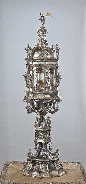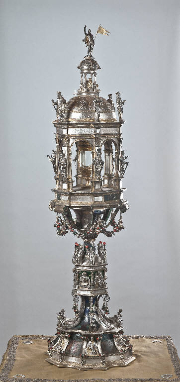• NOTIZIE STORICO CRITICHE Donato dal vescovo Carlo Pallavicino (1456-1497) alla cattedrale di Lodi, questo straordinario capolavoro orafo si inserisce, secondo Paola Venturelli, entro la concezione fortemente lombarda di architettura ornata e scolpita, con un gusto per il colore e della decorazione che strutturano la materia e la modellano rendendo difficilmente scindibile l'apporto plastico da quello architettonico e coloristico, in un orientamento generale che punta alle facciate della cappella Colleoni di Bergamo e alla Certosa di Pavia. Il tempietto a pianta centrale sembra tenere conto dell'interno della chiesa dell'Incoronata di Lodi, sorta a partire dal 1488 su disegno di Giovanni Battaggio per volere dello stesso Pallavicino. Per quanto riguarda le statuette a tutto tondo d'argento con gli Apostoli, dall'acuto patetismo e dagli esiti spezzati e nervosi dei panneggi degli abiti, così come per i Profeti ad altorilievo, confermano l'orientamento verso i Mantegazza, mentre per gli smalti con la Passione di Cristo è visibile un'influenza di Giovan Pietro Birago della fase giovale rappresentata dai corali del duomo di Brescia. Gli smalti dei Profeti illustrano, invece, un orientamento padovano-ferrarese con riferimenti sia all'arte dei Mantegazza sia a quella di Butinone della tavoletta centrale della Crocifissione del Polittico di Treviglio.