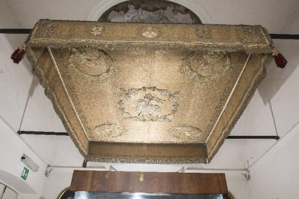 Il baldacchino è costituito da un tessuto in damasco in filo d'argento dorato ritorno a "S" e in fili di seta gialli e rosa ritorni leggermente a "S". Il damasco è foderato con un tessuto di seta rossa in punto tela (non visibile). Ai quattro angoli sono stati ricamati gli Evangelisti, posti entro tondi formati da cornucopie i cui frutti sono realizzati con piccole perle di fiume. Ogni personaggio è accompagnato dal proprio attributo e sono tutti raffigurati seduti sul trono. Al centro "l'Agnus dei" di perle circondato da un festone ricamato parimenti di perle. I pendenti, cioè le quattro bande laterali, vengono descritti con groppi alla moresca e frangia sia verso l'interno sia verso l'esterno, dove compare anche San Bassiano e lo stemma del Pallavicino.