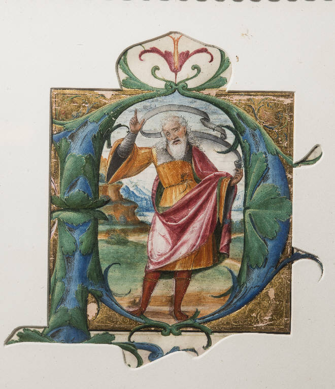 Le miniature, che presentano quasi tutti un fondo oro, raffigurano: la lettera P decorata con elementi floreali in azzurro e verde, nel cui campo interno su uno sfondo paesaggistico vi è un profeta stante che regeg con la sinistra un cartiglio, mentre con l'indice della mano destra indica verso l'alto; letetra N con la raffigurzione della Annunciazione ambientata in un portico di classicheggiante. A sinistra l'Angelo saluta la Vergine, seduta a un banco di lettura, mentre con atteggiamento smarrito accogli l'annuncio; lettera G, decorata con mostri marini e un fregio fitomorfo, in cui si nota un paesaggio di campagna in cui dorme un profeta, mentre a destra tre dignitari sono in attegiamento di attesa; lettera P con l'Adorazione dei pastori, che si svolge davanti ad una grotta, mentre sullo sfondo si nota l'annuncio degli angeli ai pastori; lettera O con la Crocifissione; lettera L con un profeta a mezzo busto che predica dal pulpito; lettera I con l'Entrata di Cristo a Gerusalemme. Infine cinque lettere, G, S, I, E, K ritagliate, col corpo fitomorfo.