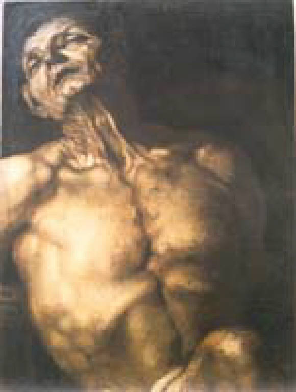 - NOTIZIE STORICO CRITICHE Questa drammatica rappresentazione di S. Bartolomeo, evidente ritaglio da una tela più grande, è stata attribuita a Jusepe de Ribera, detto Lo Spagnoletto (1591-1652), o a pittori della sua scuola. Attivo nella prima metà del Seicento, nella sua produzione si notano influenze della pittura caravaggesca e ascendenze venete e bolognesi. Il colorismo freddo, fondato su intensi contrasti chiaroscurali, fa pensare che questa opera sia da attribuire ai primi lavori napoletani del Ribera. Il martirio di S. Bartolomeo, come quello di altri santi, è un tema assai caro al Ribera (opere omonime si trovano a Firenze, Madrid, Washington). Il personaggio raffigurato sarebbe invece S. Gerolamo, secondo altra interpretazione, soggetto rappresentato altre volte dal Ribera, che però non mostrerebbe qui la consueta iconografia. A S. Bartolomeo, uno dei dodici apostoli, è attribuita una lunga attività missionaria che sembra l'abbia condotto fino in India. Secondo la tradizione sarebbe stato martirizzato in Armenia mediante crocifissione (secondo il cristianesimo orientale), decapitato (Rabano Mauro e Usuardo), o scorticato (martirologio di Beda). Le sue diverse iconografie vanno perciò lette in questo senso. Rappresentato a volte con un libro o un rotolo in mano, simbolo dell'attività di apostolato, altre volte è raffigurato durante il martirio: in occidente si preferisce di solito la versione in cui è scorticato, per cui il Santo compare a volte con un coltello e con la sua pelle in mano.