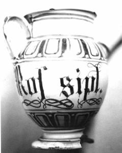 Brocchetta con collo cilindrico, corpo ovoide ansa e becco, piede sagomato. Colori: blu su fondo bianco.